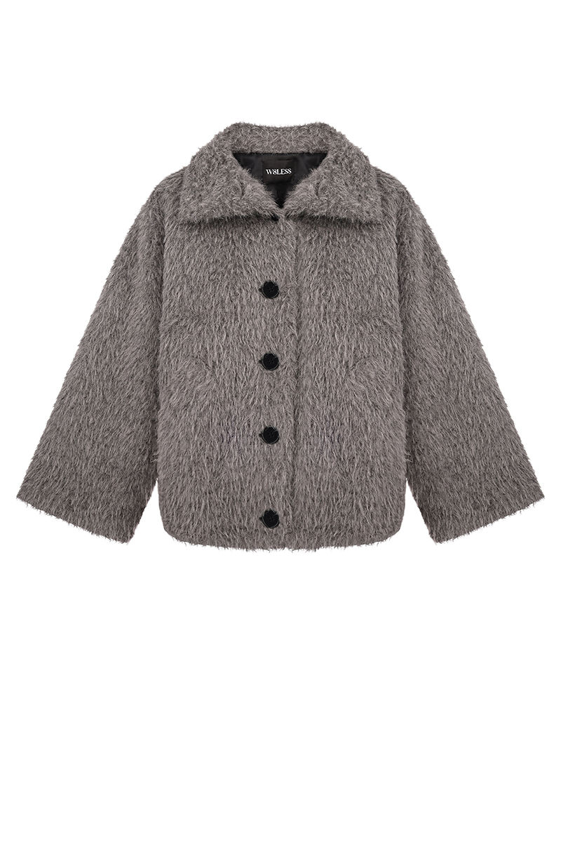 A model with a classic stand-up collar, large buttons and neat pockets.
