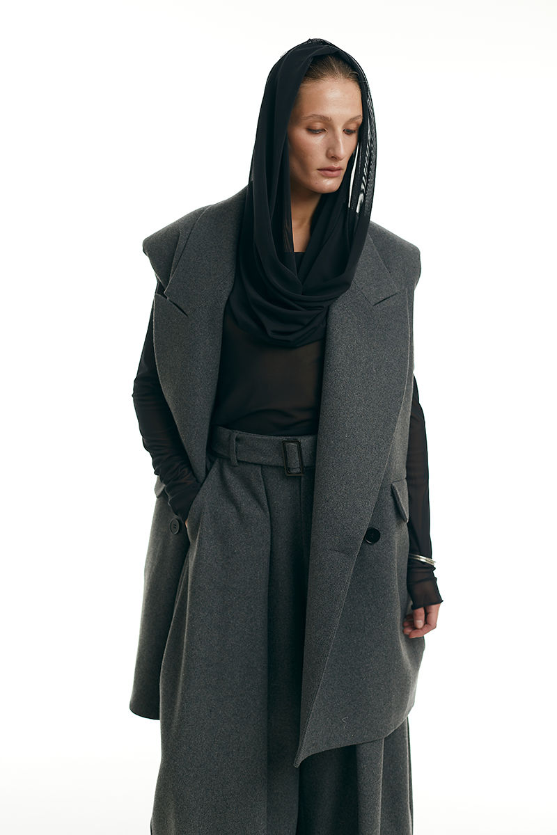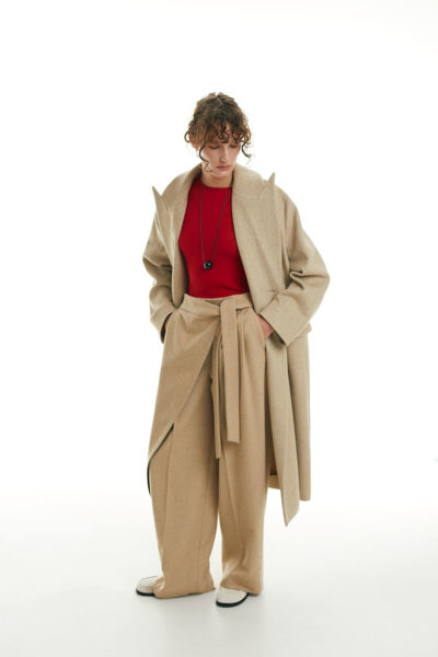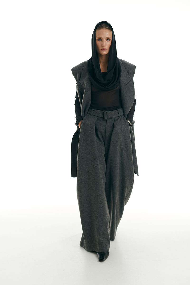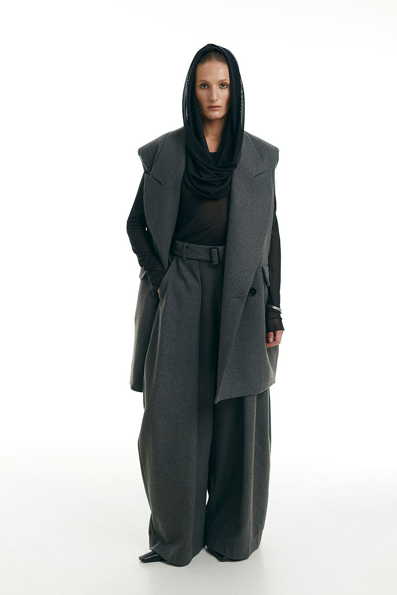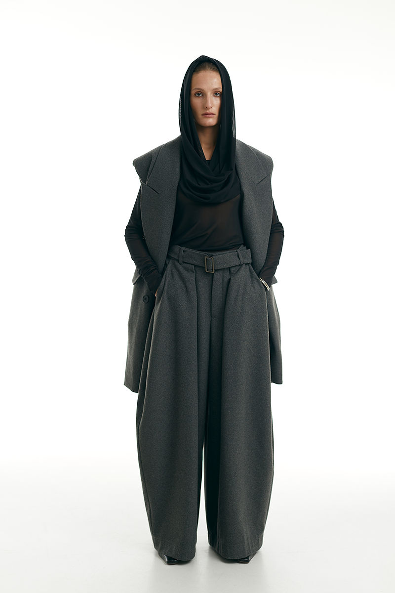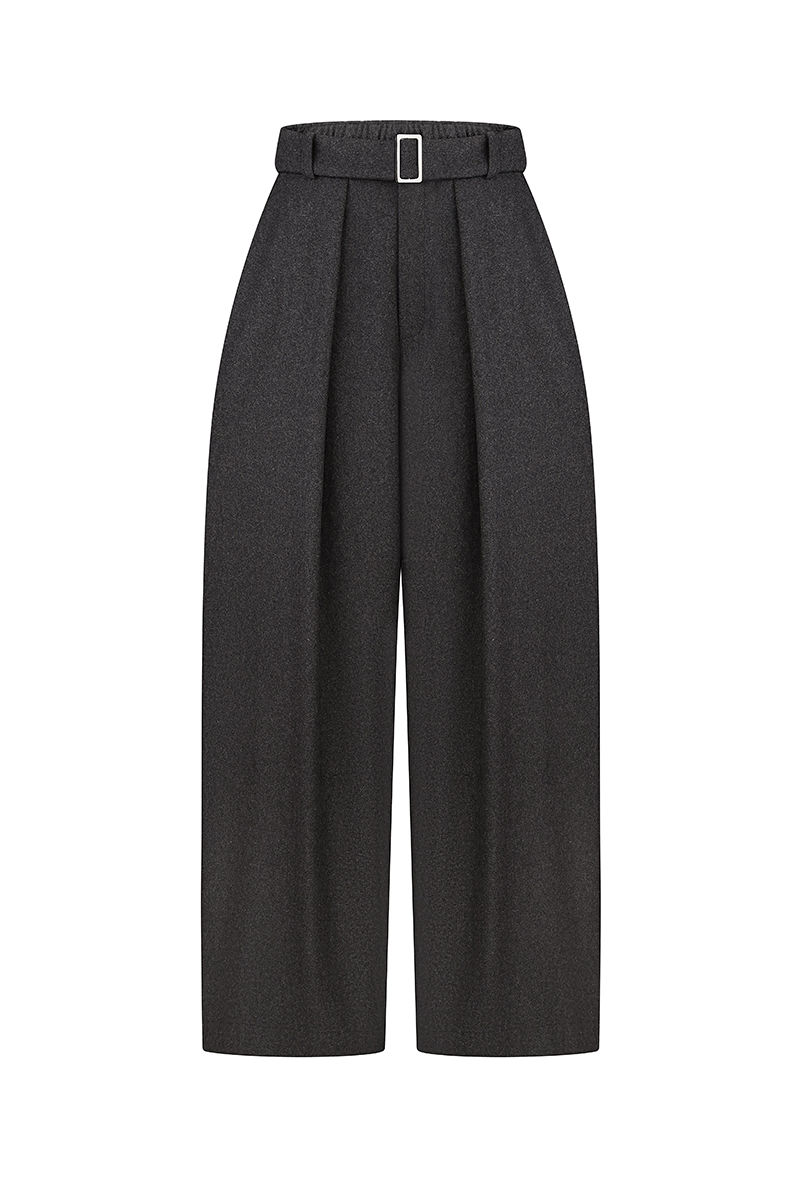 The trousers have a high waist, a voluminous wide cut and deep pleats in the front, creating a modern silhouette.