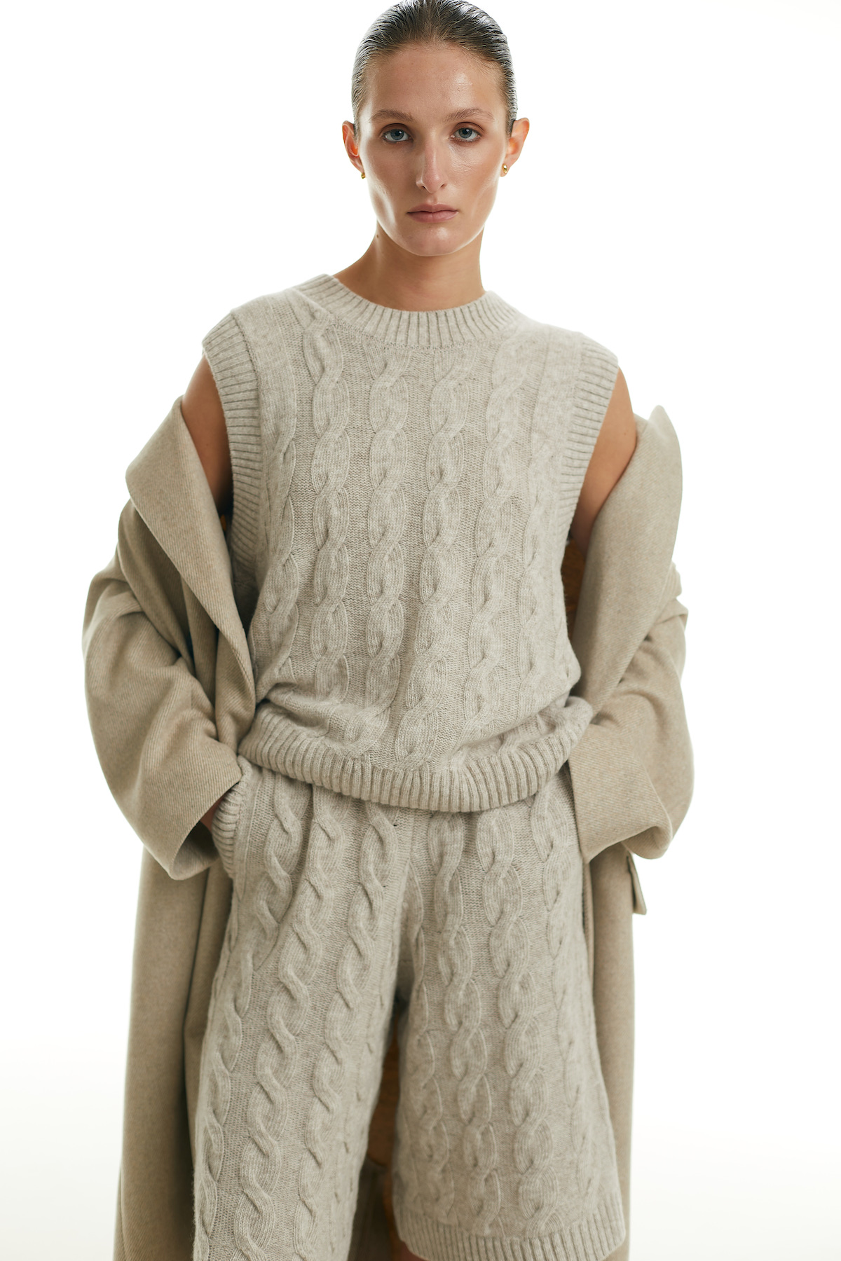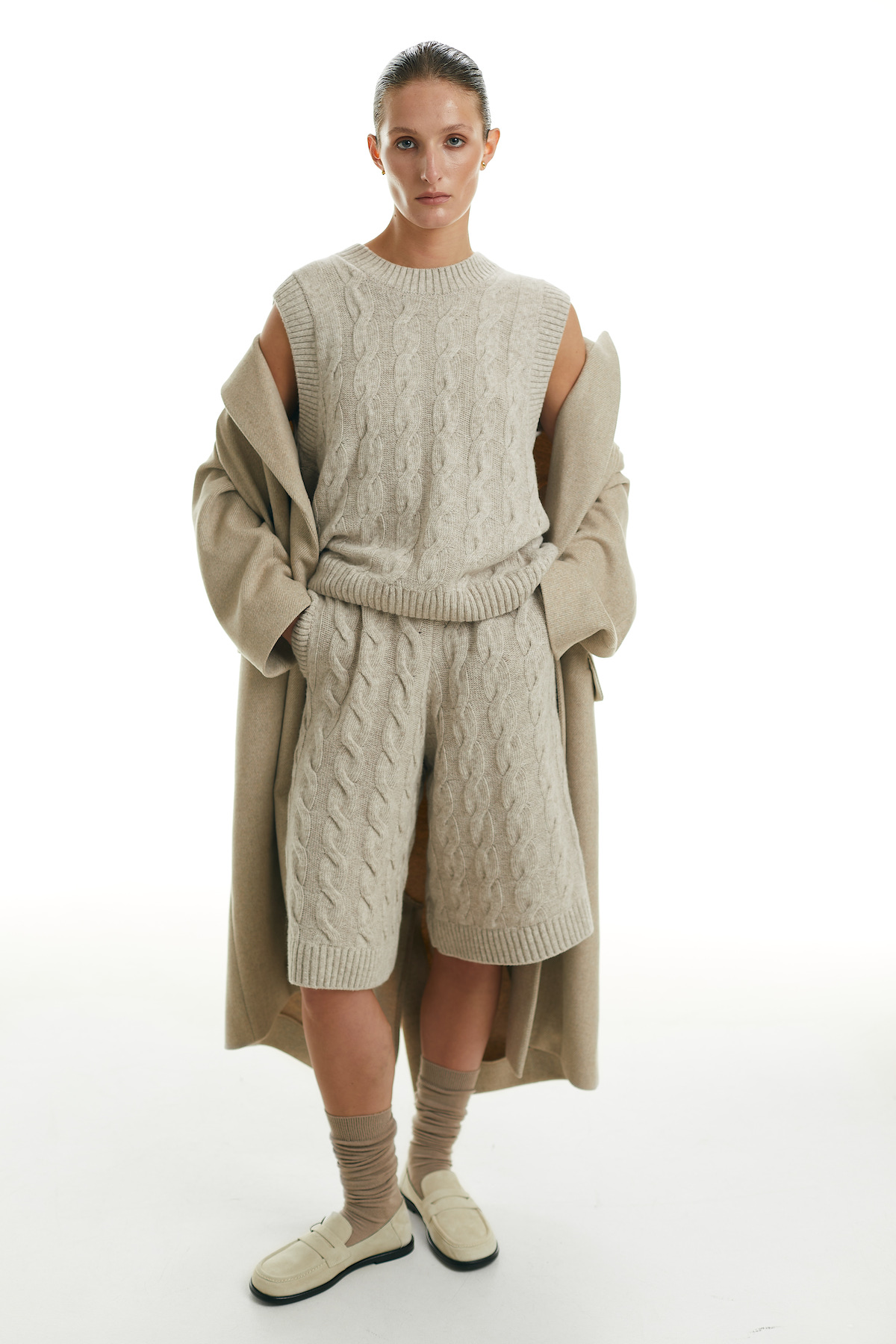 The shorts combine an interesting knit with a braid pattern, a trendy cut, convenience and practicality.