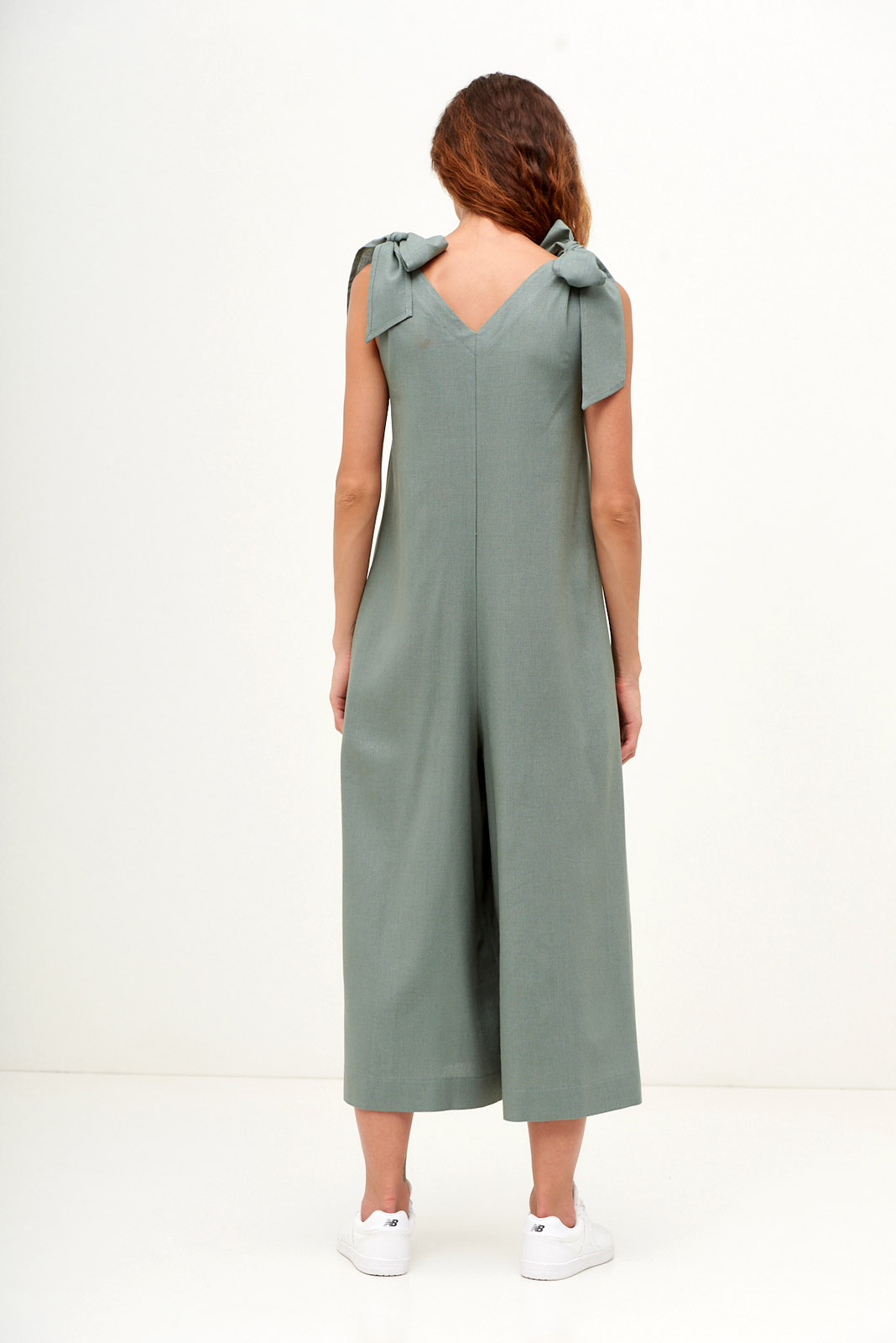 Jumpsuit with buttons, straps with ties can be adjusted to any height.