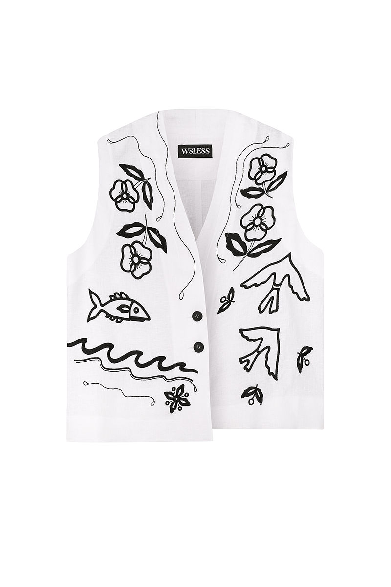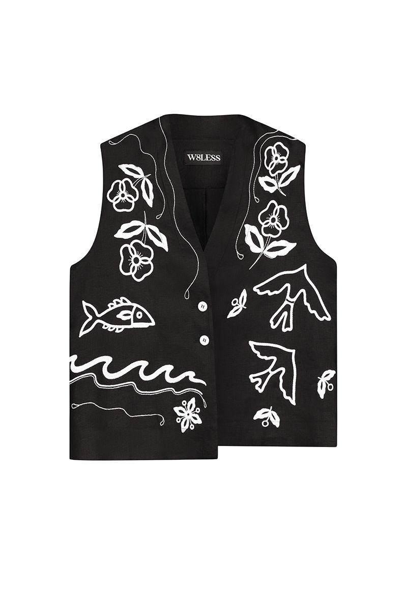 The vest will perfectly match the linen embroidered products of Where the Sea Is.