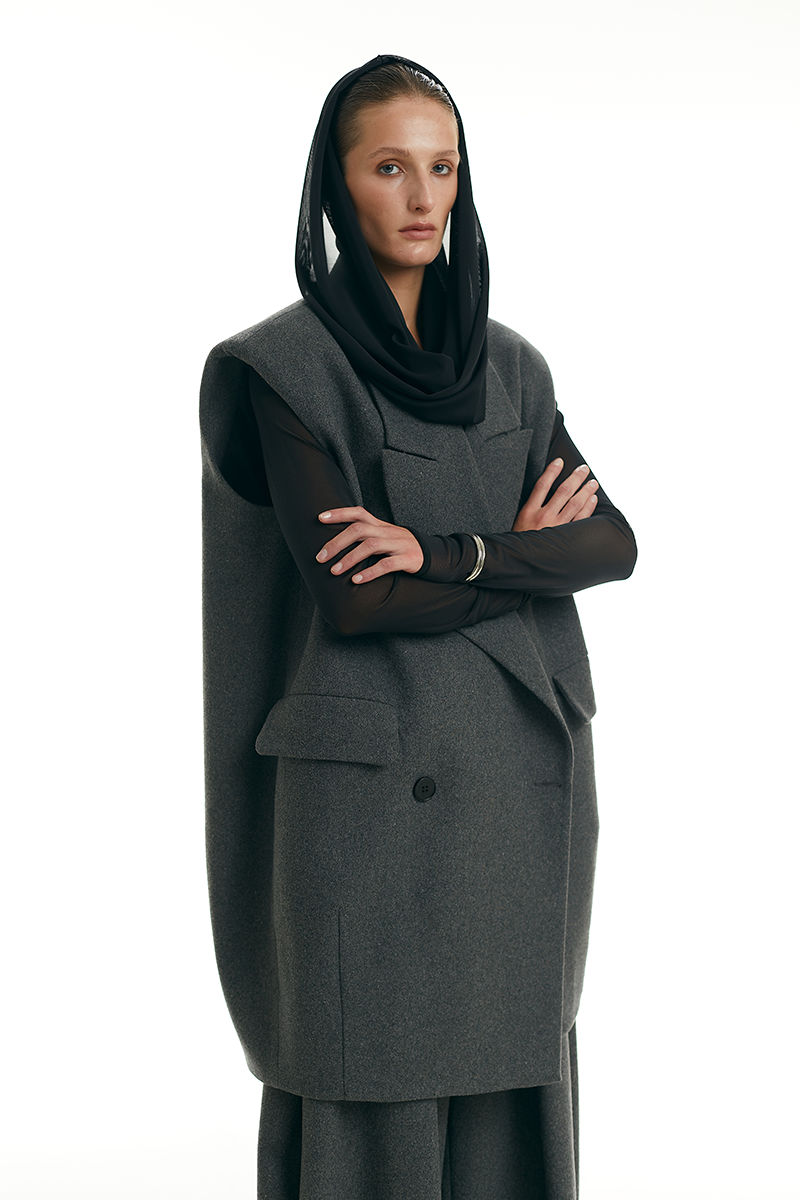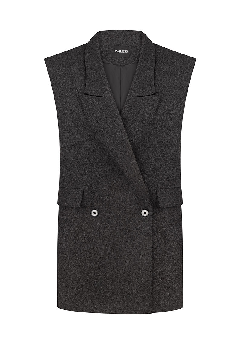 The vest has a straight, loose cut, emphasized shoulders and classic lapels, which give the product structure.