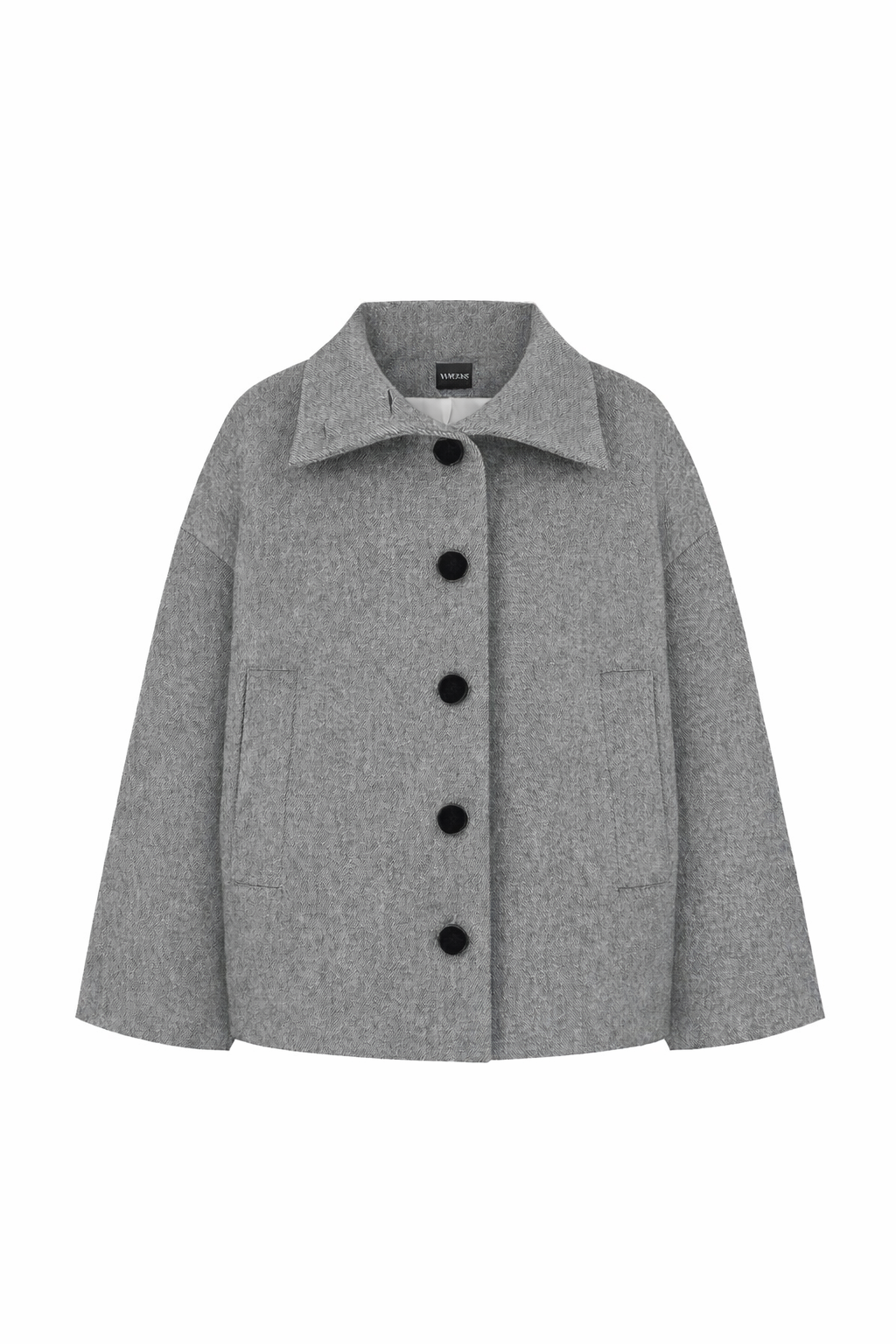 Пальто вкорочене, має класичний відкладний комір, застібка на ґудзики.