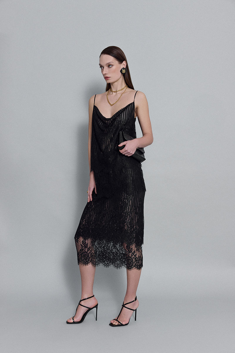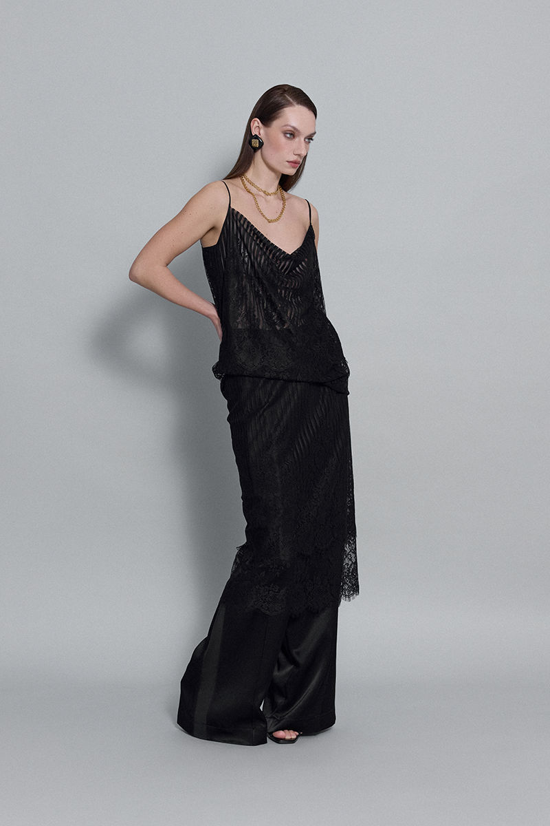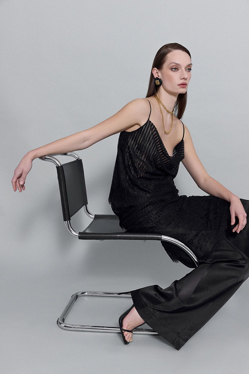 Виконаний з двох шарів мережива, де верхній шар має візерунок у тонку вертикальну смужку, а нижній створює м’який контраст фактур.