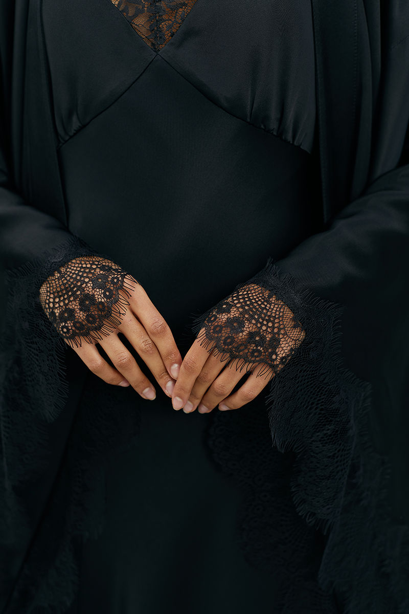Виріб має широкі декоративні рукава прикрашені делікатним мереживом з плавною лінією розширення, що надає образу виразності та акценту.