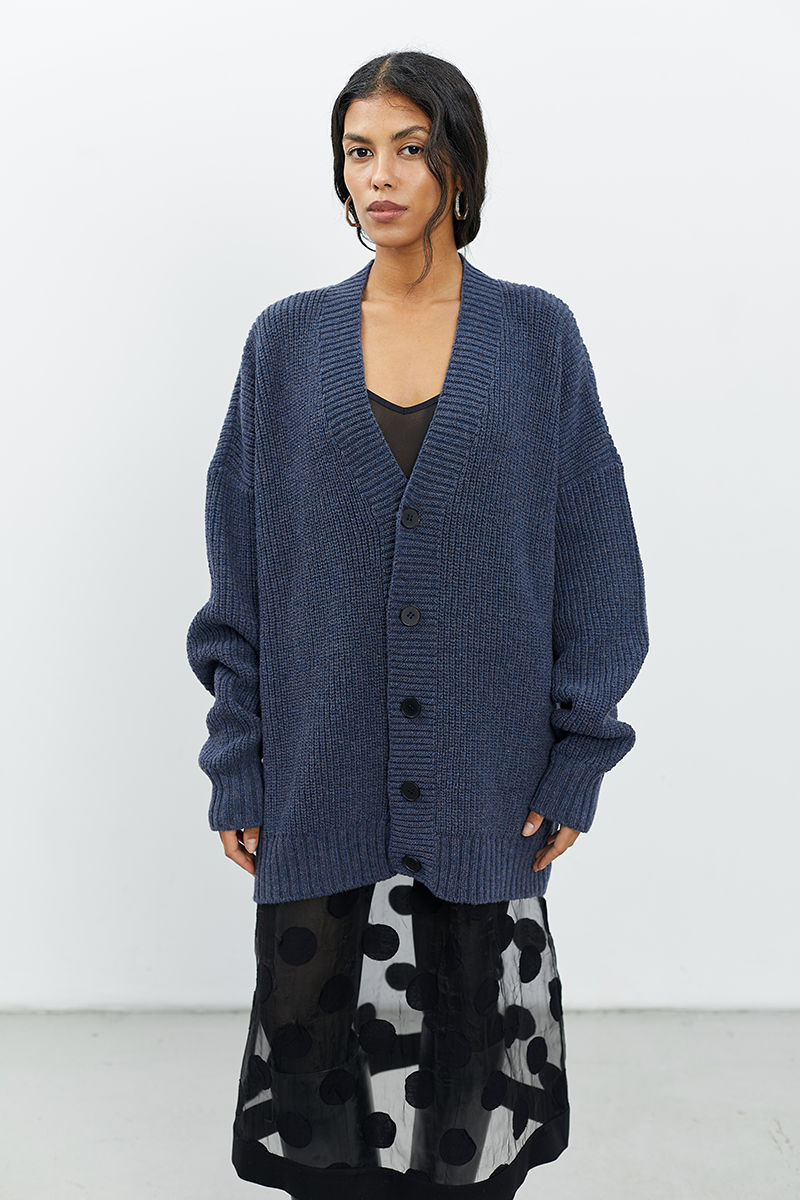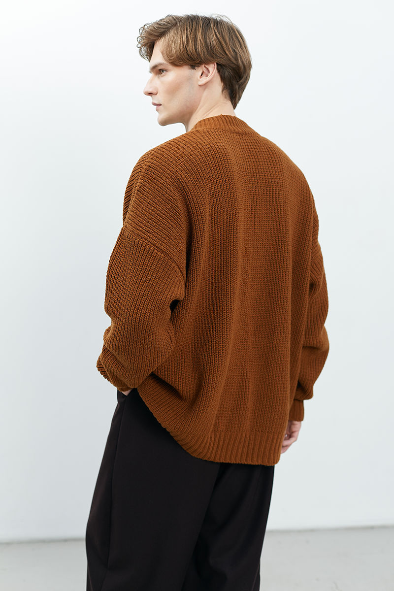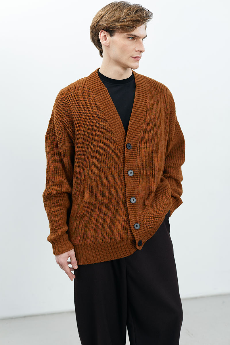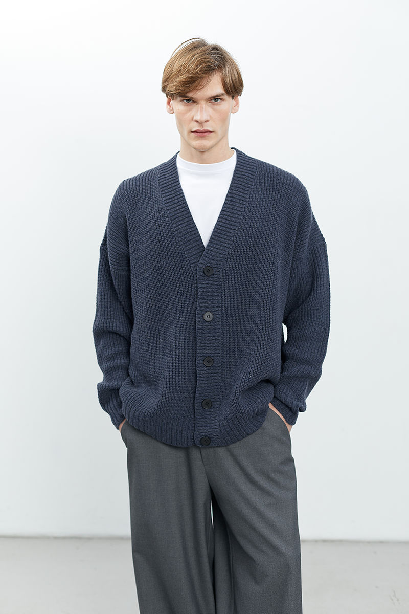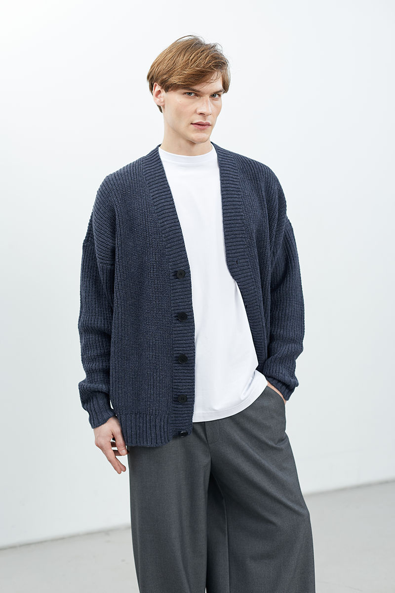 Об’ємний кардиган на ґудзиках, універсальний дизайн, який органічно виглядає як у чоловічих, так і в жіночих образах.