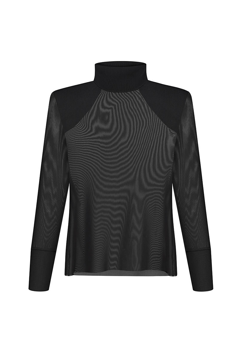 Напівпрозорий гольф із делікатної еластичної сітки, доповнений підплічниками, що формують виразну лінію плеча.