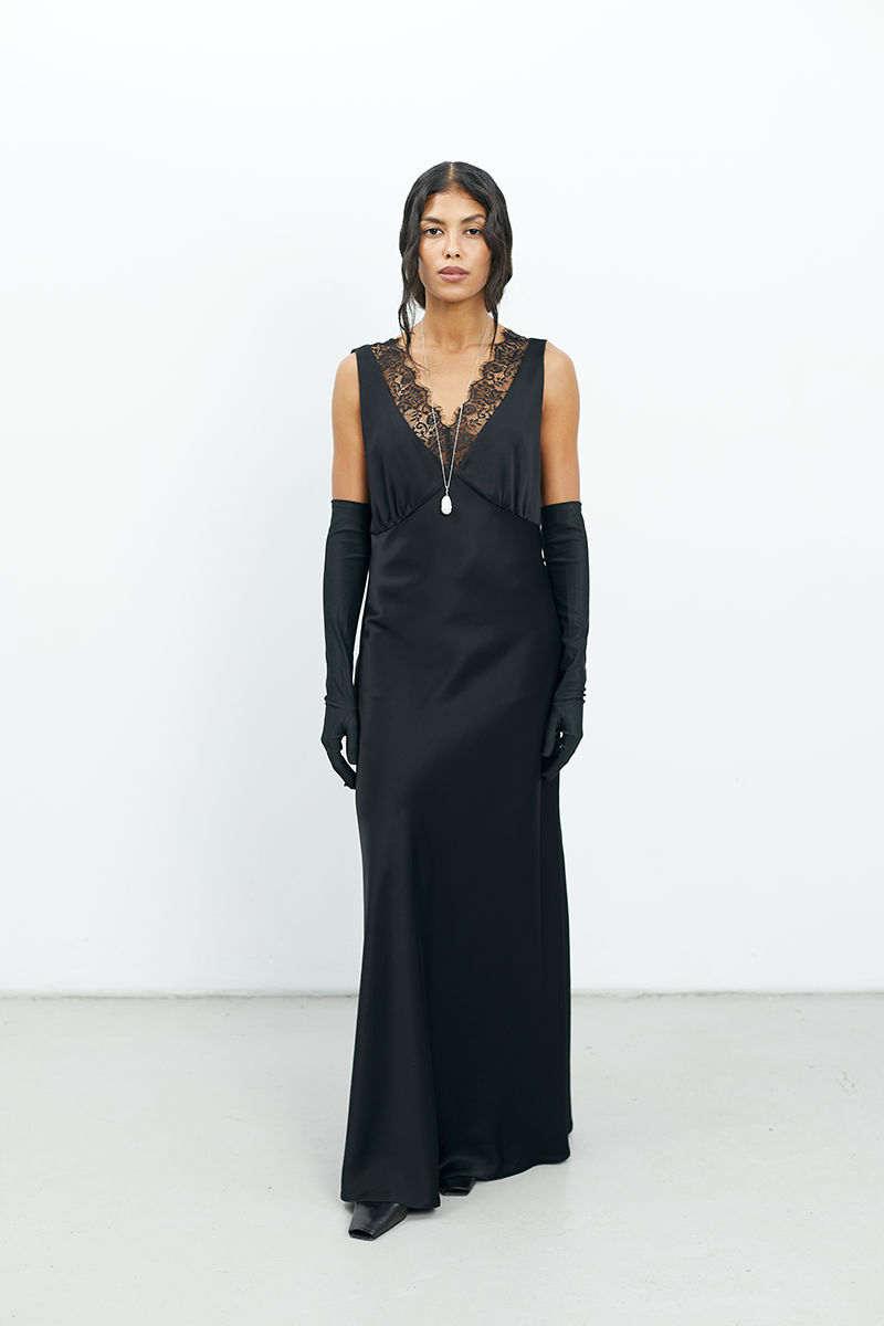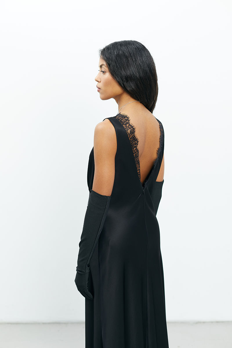 Сукня з м’якої, струмкої віскози, що створює елегантний напівприталений силует.