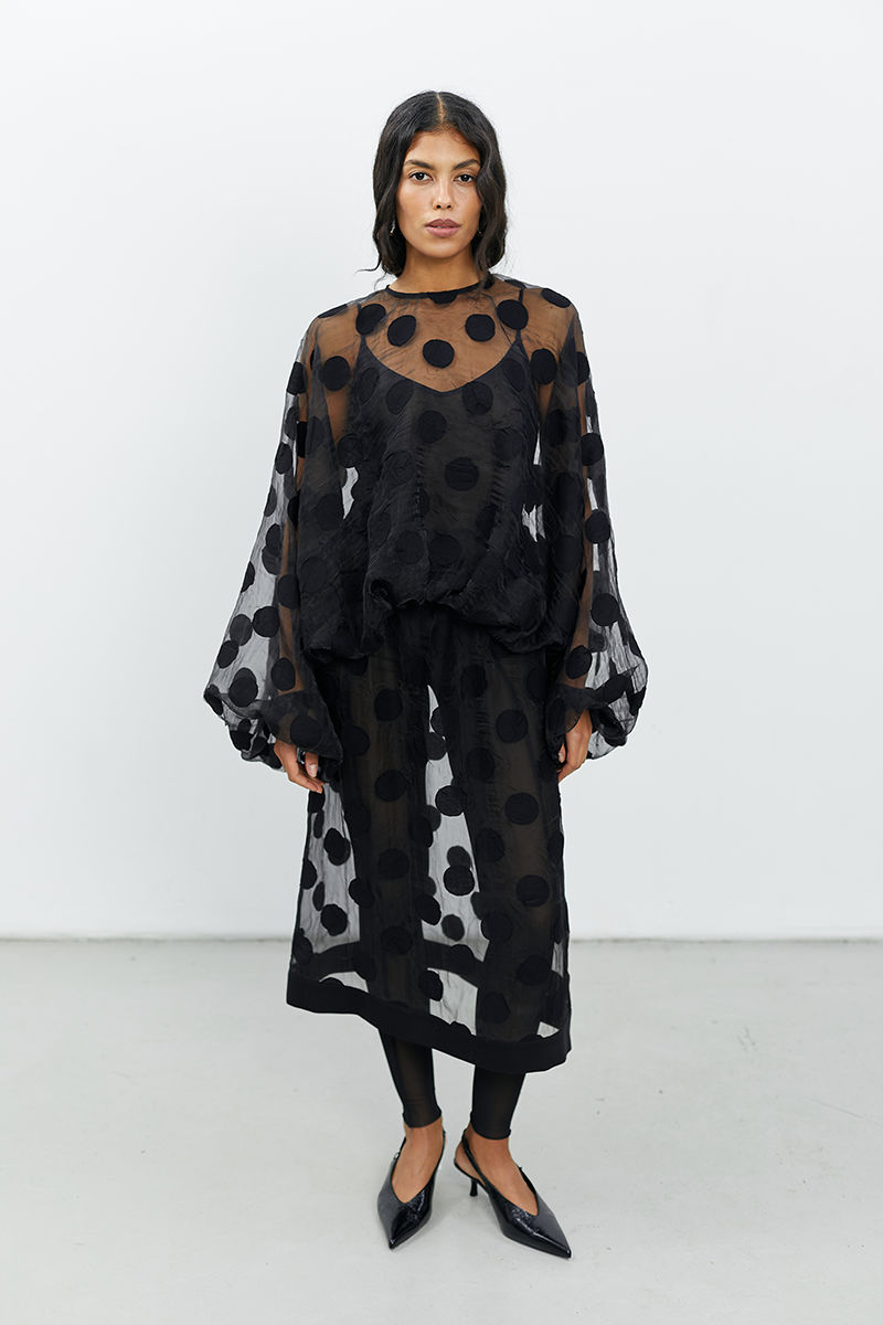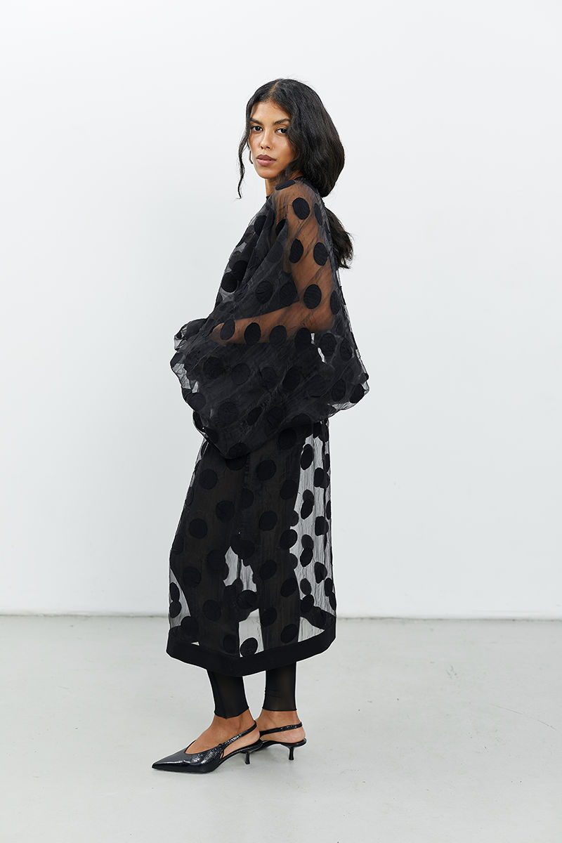Модель виконана з напівпрозорої тканини, що створює легкий, рухливий силует.